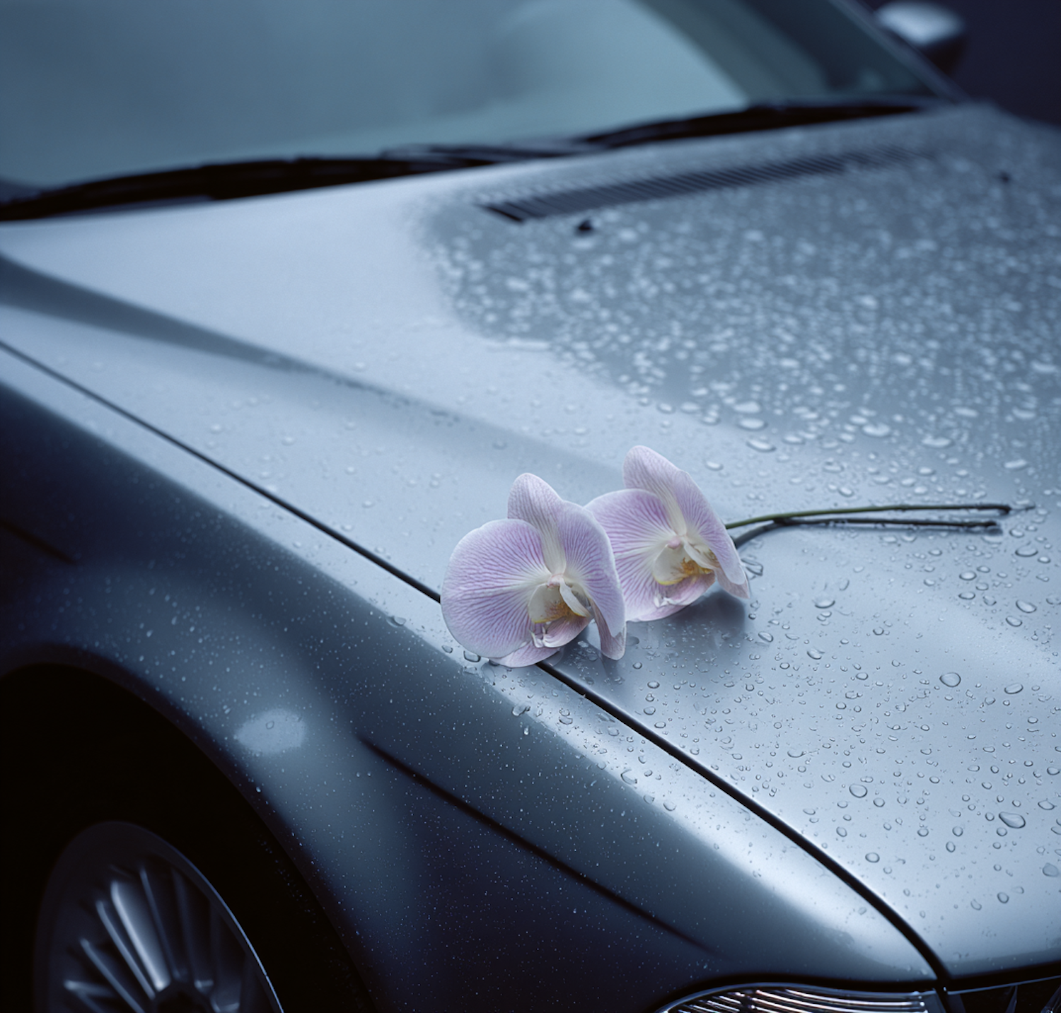 A sleek car hood with water droplets and two delicate purple orchids, creating a striking contrast of elegance and modernity.