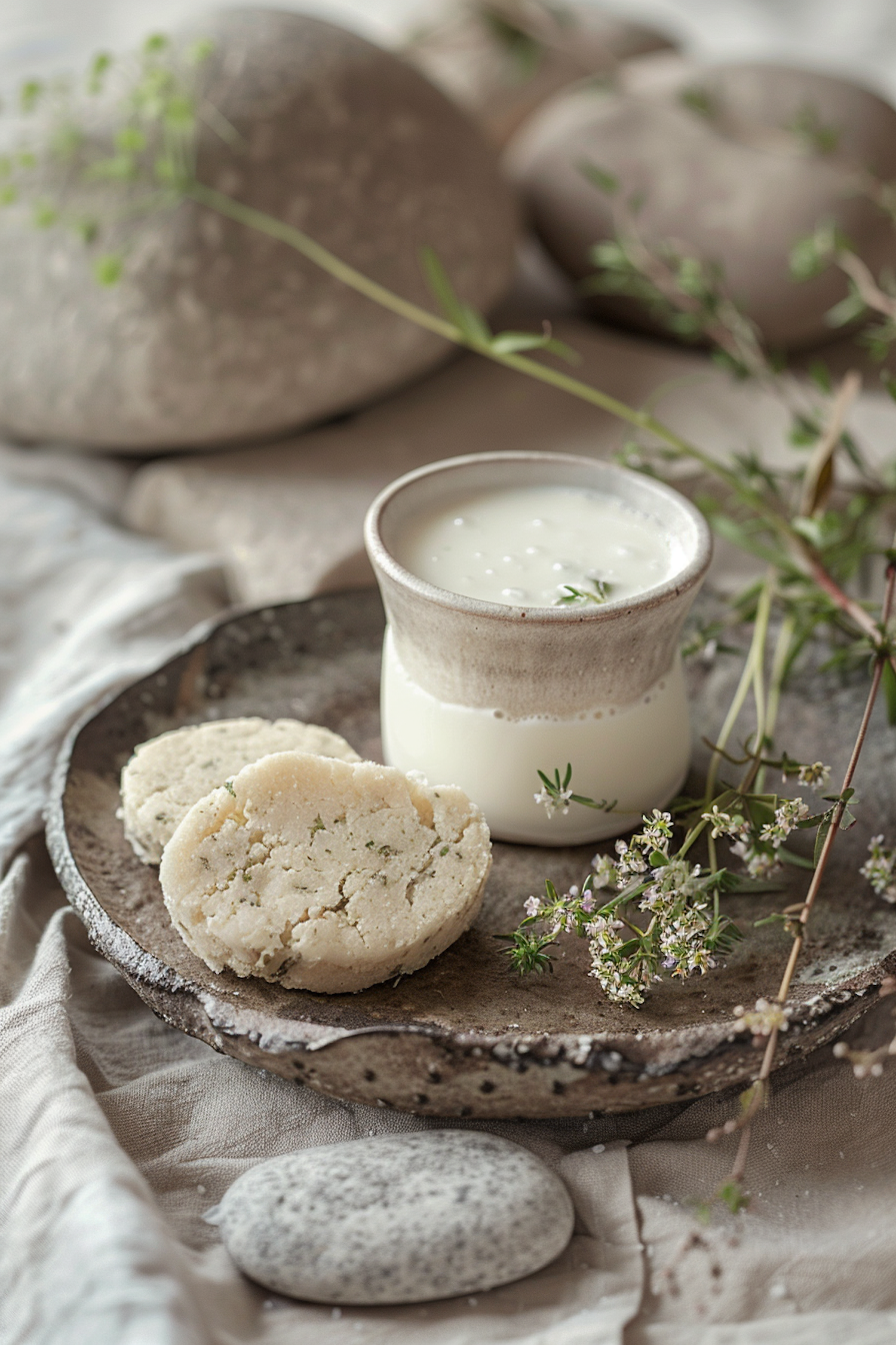 Rustic ceramic cup with creamy drink and herb biscuits on an earthy plate, surrounded by flowers and stones for a serene, natural vibe.