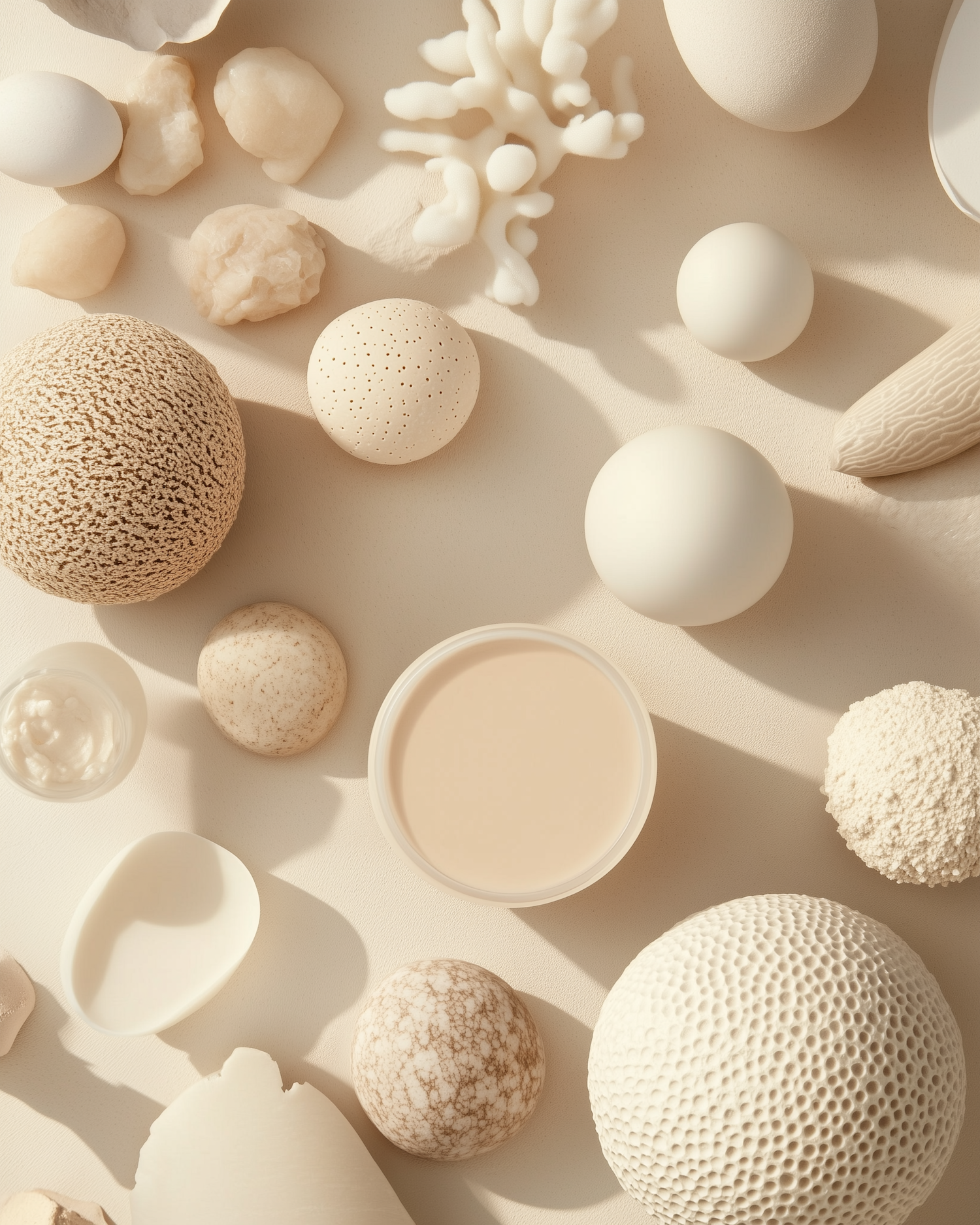 Aesthetic arrangement of textured spheres and natural shapes in neutral tones on a beige surface, highlighting intricate patterns.
