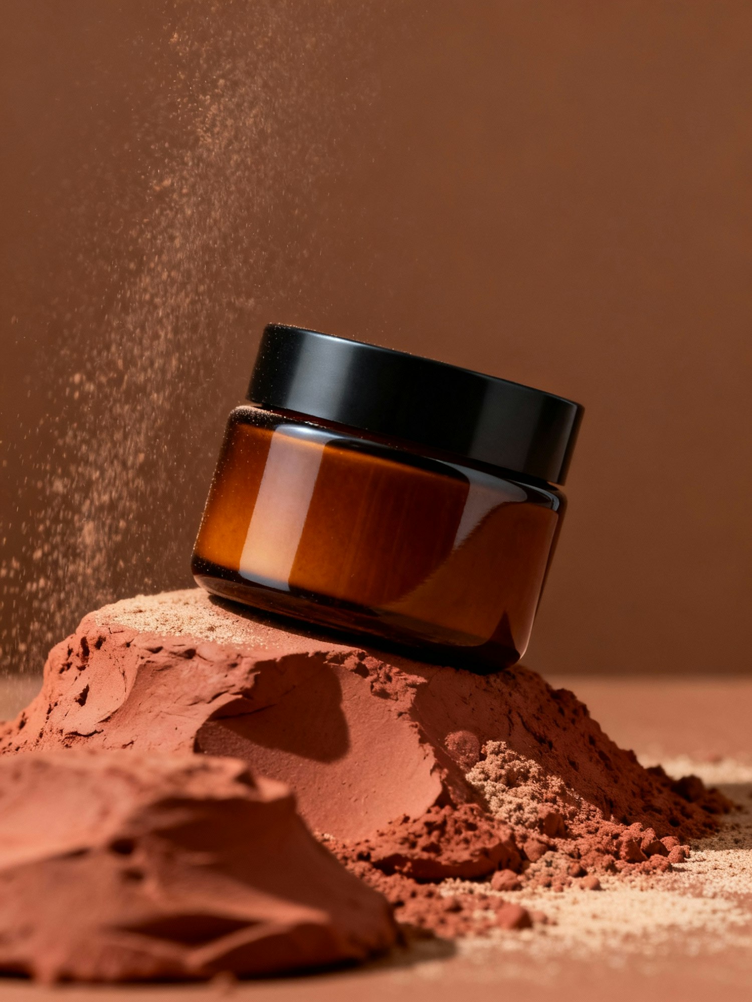 Studio product photography in a refined, sculptural, and organic art direction — matte amber glass packaging with a black lid, minimalist and label-free, placed against a warm brown studio background. The lighting is soft, directional, and diffused from one side, creating gentle shadows and a natural sense of depth. The overall atmosphere is earthy and calm, with warm tones, tactile textures, and a poetic balance between raw materials and crafted elegance. Style inspired by high-end skincare campaigns — natural sophistication, sensory minimalism, and sculptural composition. A wide amber jar placed on a sculpted mound of reddish clay, surrounded by fine powder dust as if it had been freshly molded. The jar is slightly tilted, catching soft highlights across its curved surface.