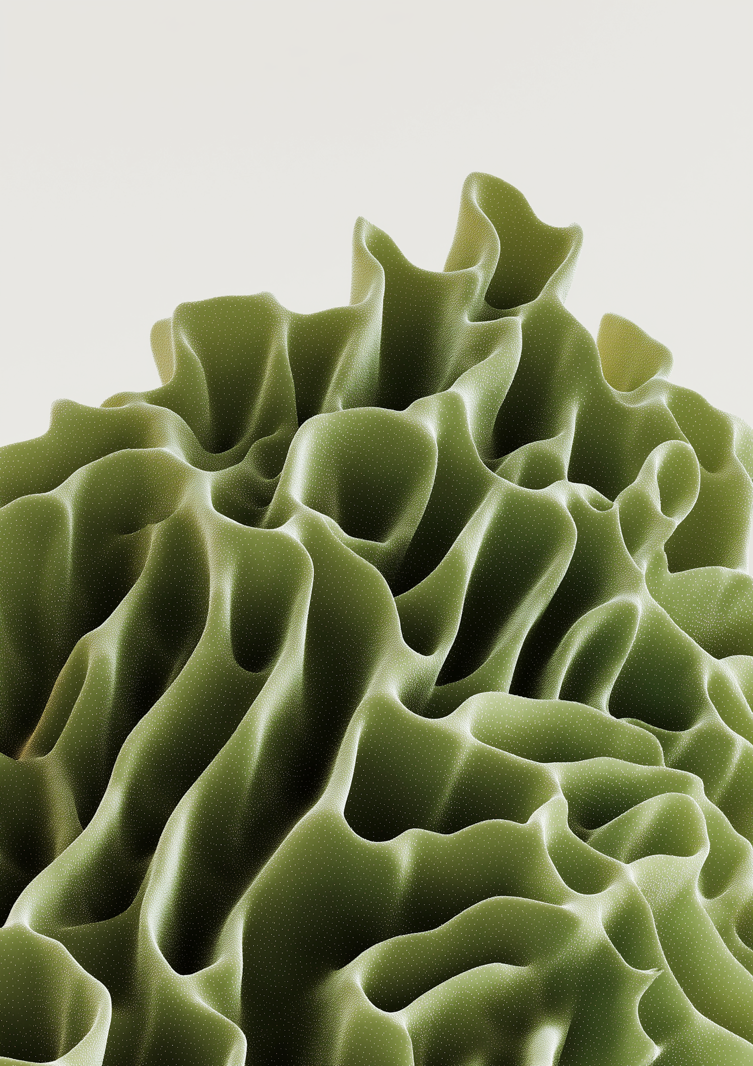 A close-up of a green, wavy, textured surface with a dotted pattern, resembling organic formations, set against a neutral background.
