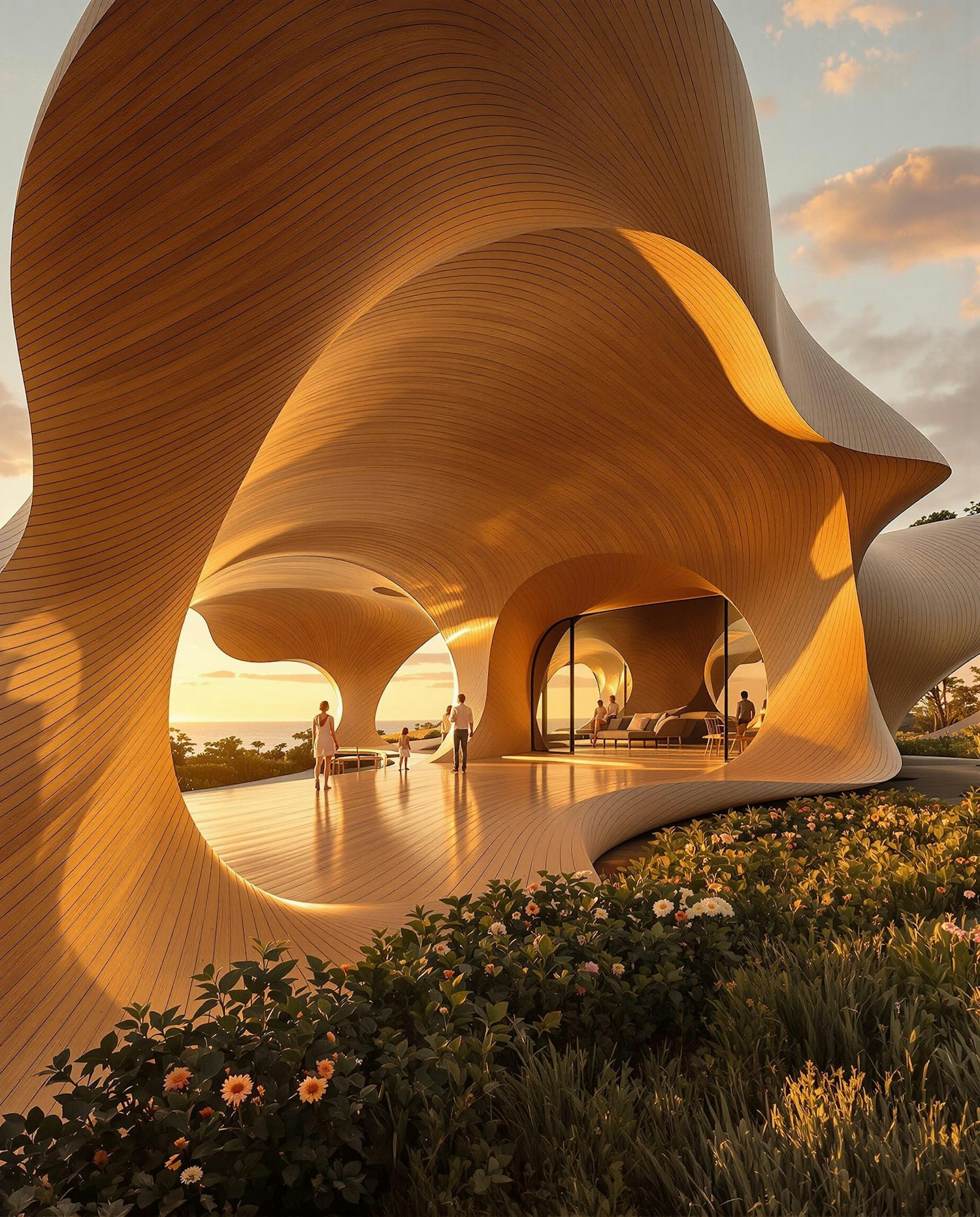 A breathtaking wooden pavilion with flowing curves, warm sunset lighting, and lush gardens, overlooking the ocean for a serene ambiance.