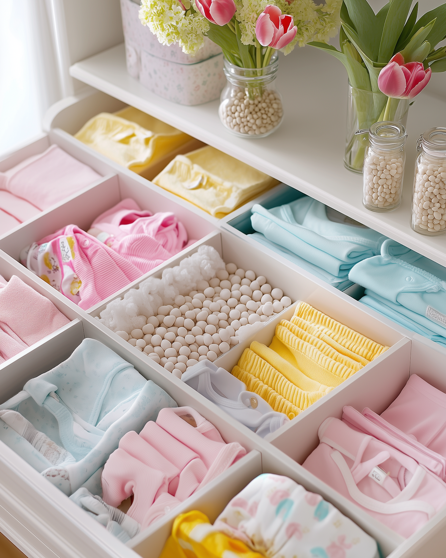 Organized drawer with pastel baby clothes, decorative jars, and fresh flowers, creating a serene nursery vibe.