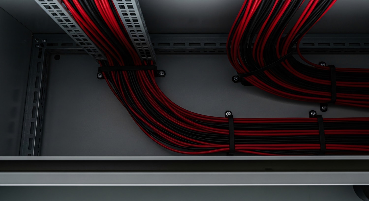 Neatly organized red and black cables secured in a metal enclosure, showcasing professional cable management and system organization.