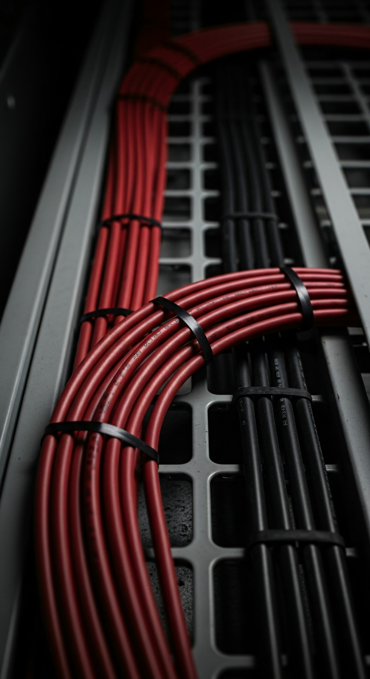 Close-up of red and black cables neatly organized on a metallic grid, secured with ties, showcasing precision and order.
