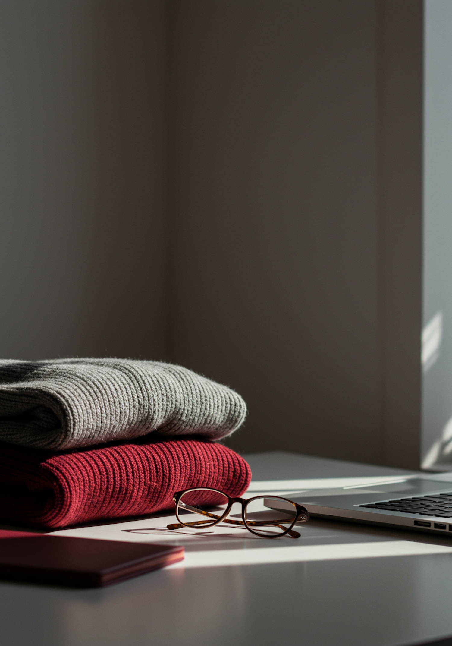 A cozy setup with folded sweaters, glasses, and a laptop on a white desk, bathed in soft natural light.