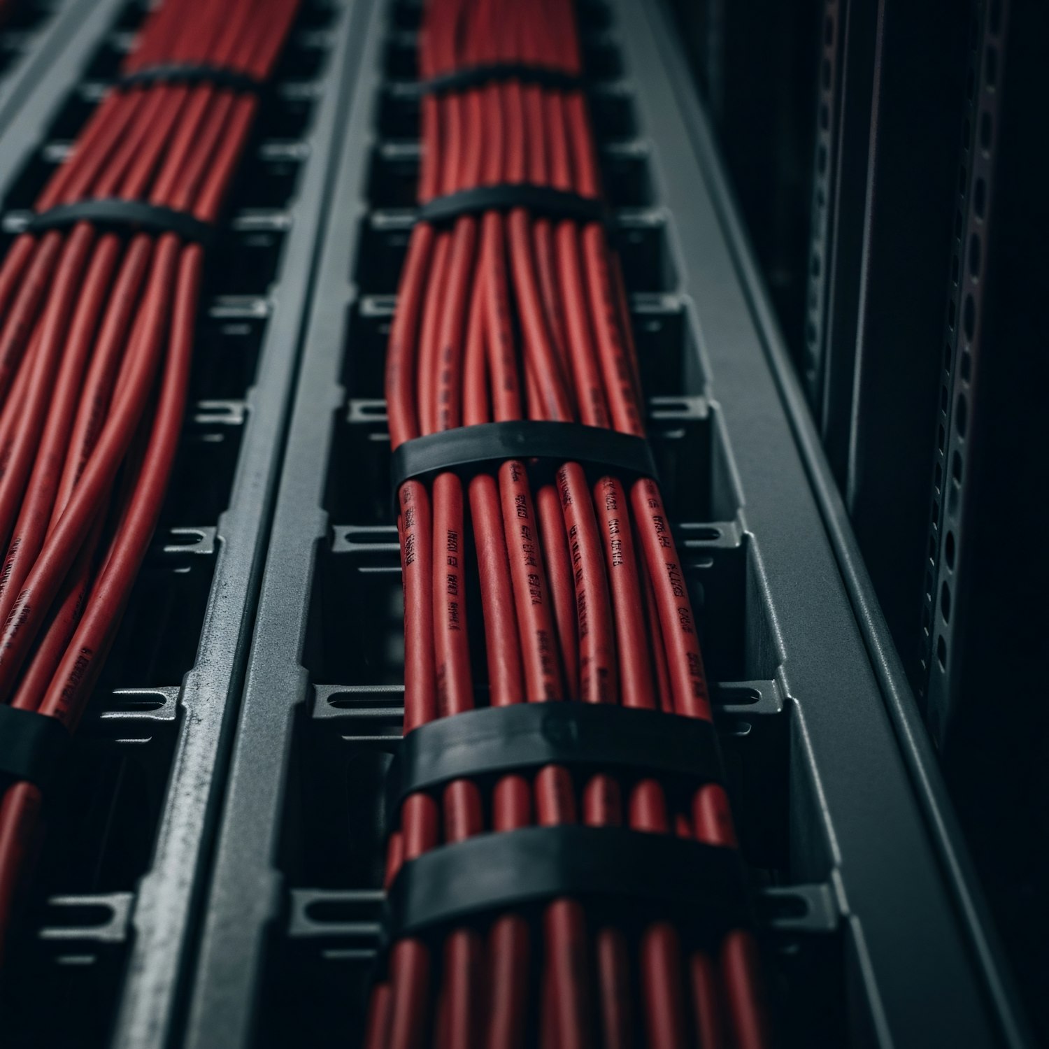 Close-up of neatly organized red cables in a cable management system, showcasing precision and professional setup in a data center.