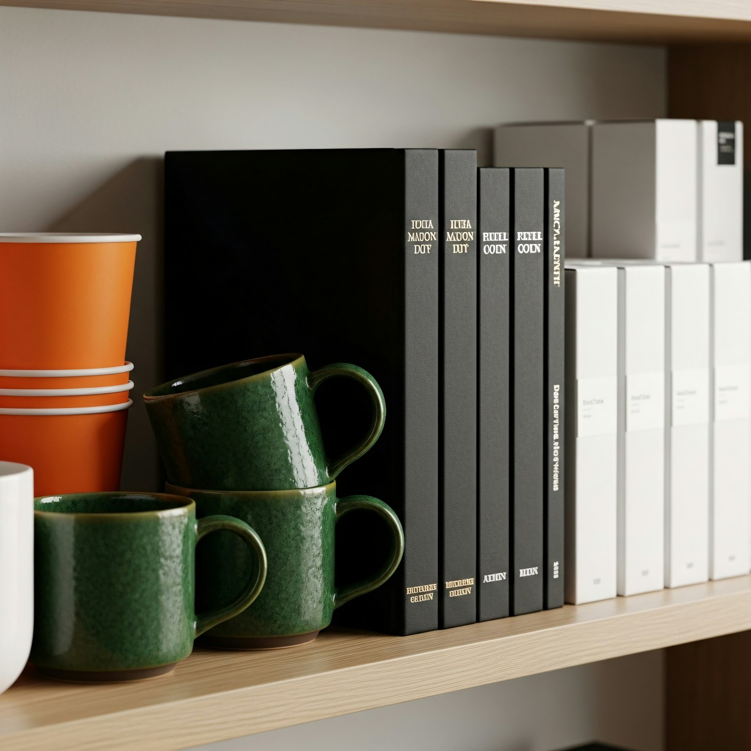 A stylish shelf arrangement with green mugs, orange cups, black books, and white boxes, creating a modern and organized look.
