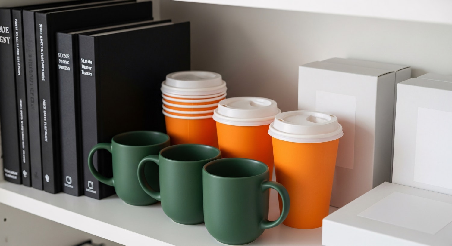 Organized shelf with black books, orange coffee cups, green mugs, and white boxes, creating a clean and minimalistic aesthetic.