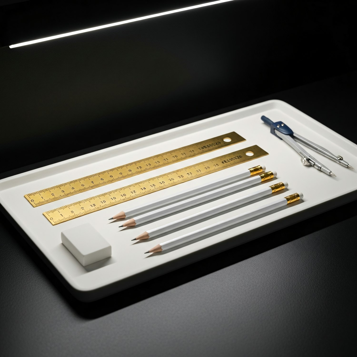 A sleek arrangement of golden rulers, white pencils, a compass, and an eraser on a white tray, perfect for a modern workspace.