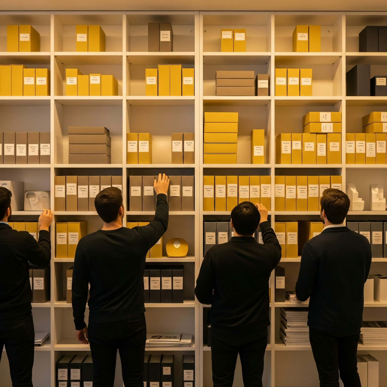 Four people organize labeled yellow and gray boxes on a large shelving unit in a well-lit storage area.