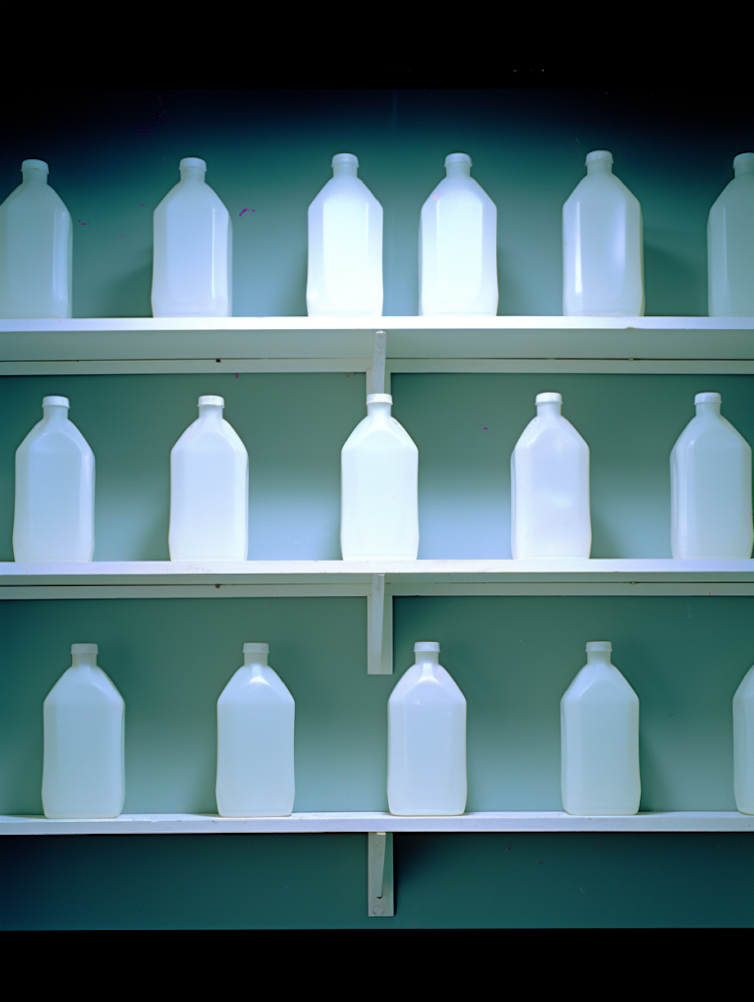 Minimalist arrangement of white plastic bottles on shelves against a teal wall, creating a symmetrical and orderly pattern.