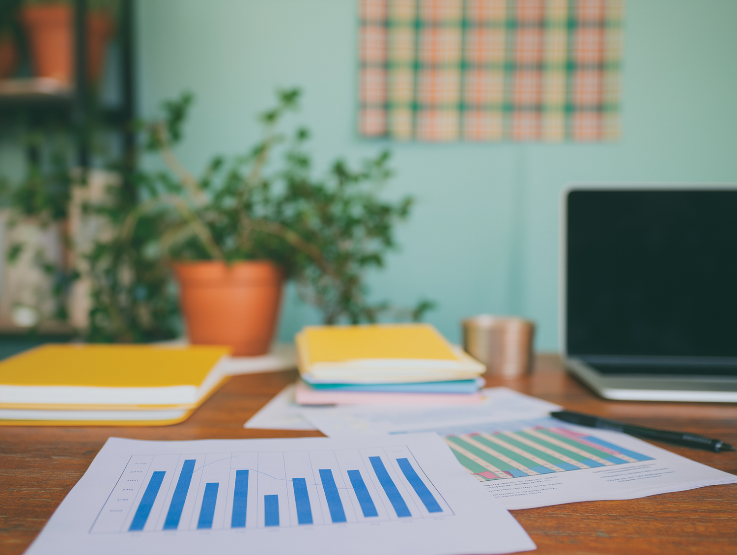 A cozy workspace with a laptop, documents, and a potted plant on a wooden desk, perfect for productivity and focus.