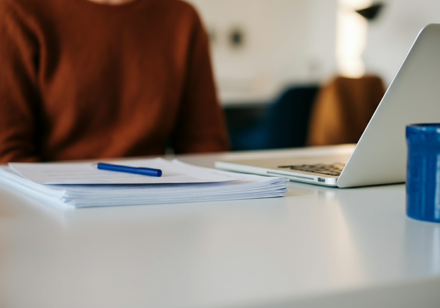 Organized workspace with papers, a blue pen, a laptop, and a mug on a white desk. Perfect for productivity or study vibes.