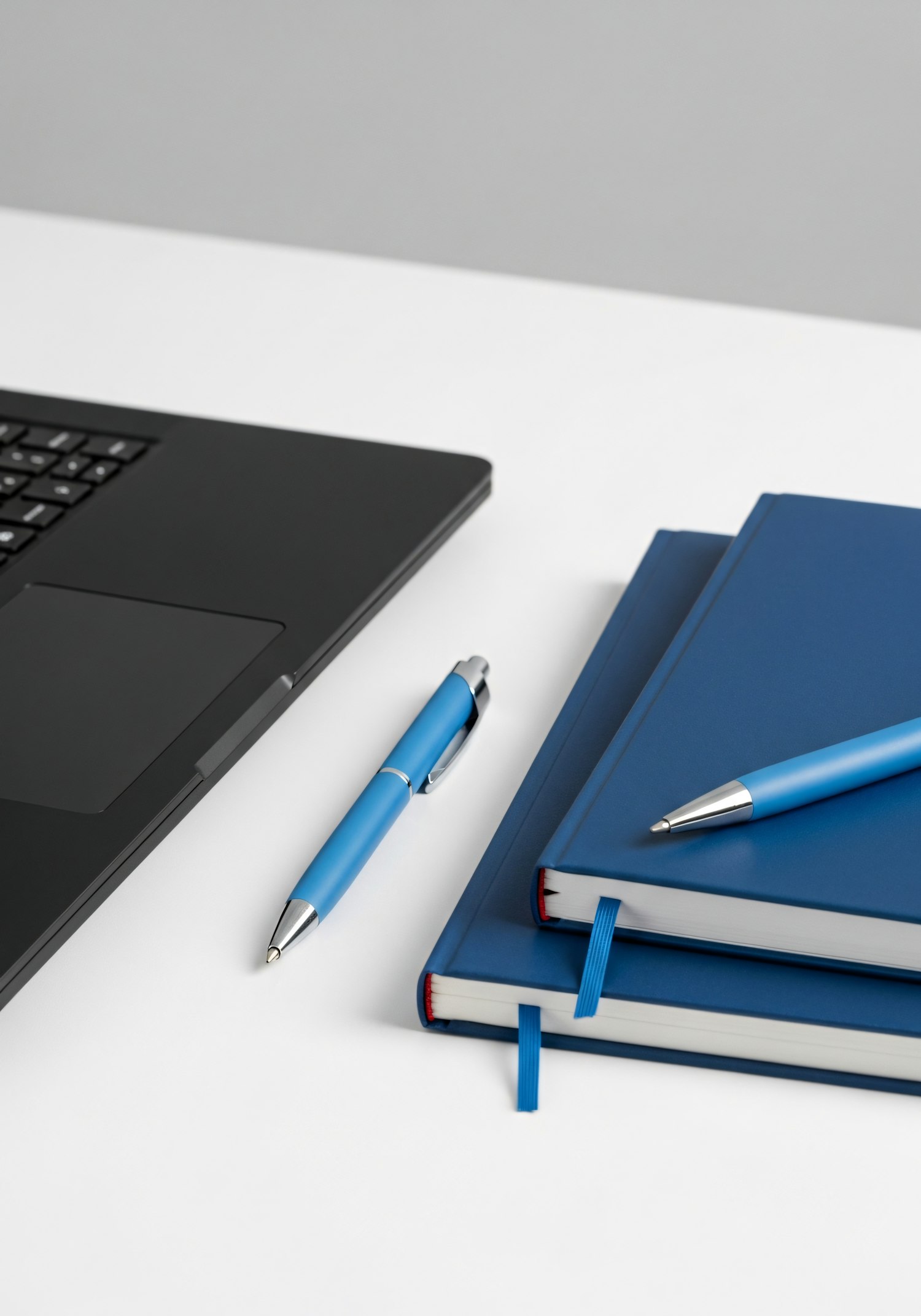 A clean workspace with a black laptop, blue notebooks, and matching pens on a white desk, creating a professional and organized vibe.