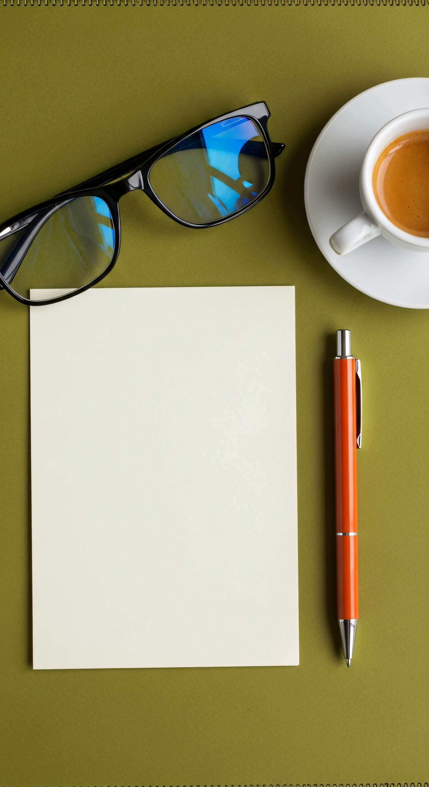 Flat lay of a notepad, glasses, orange pen, and espresso cup on a green surface, perfect for a workspace or productivity theme.