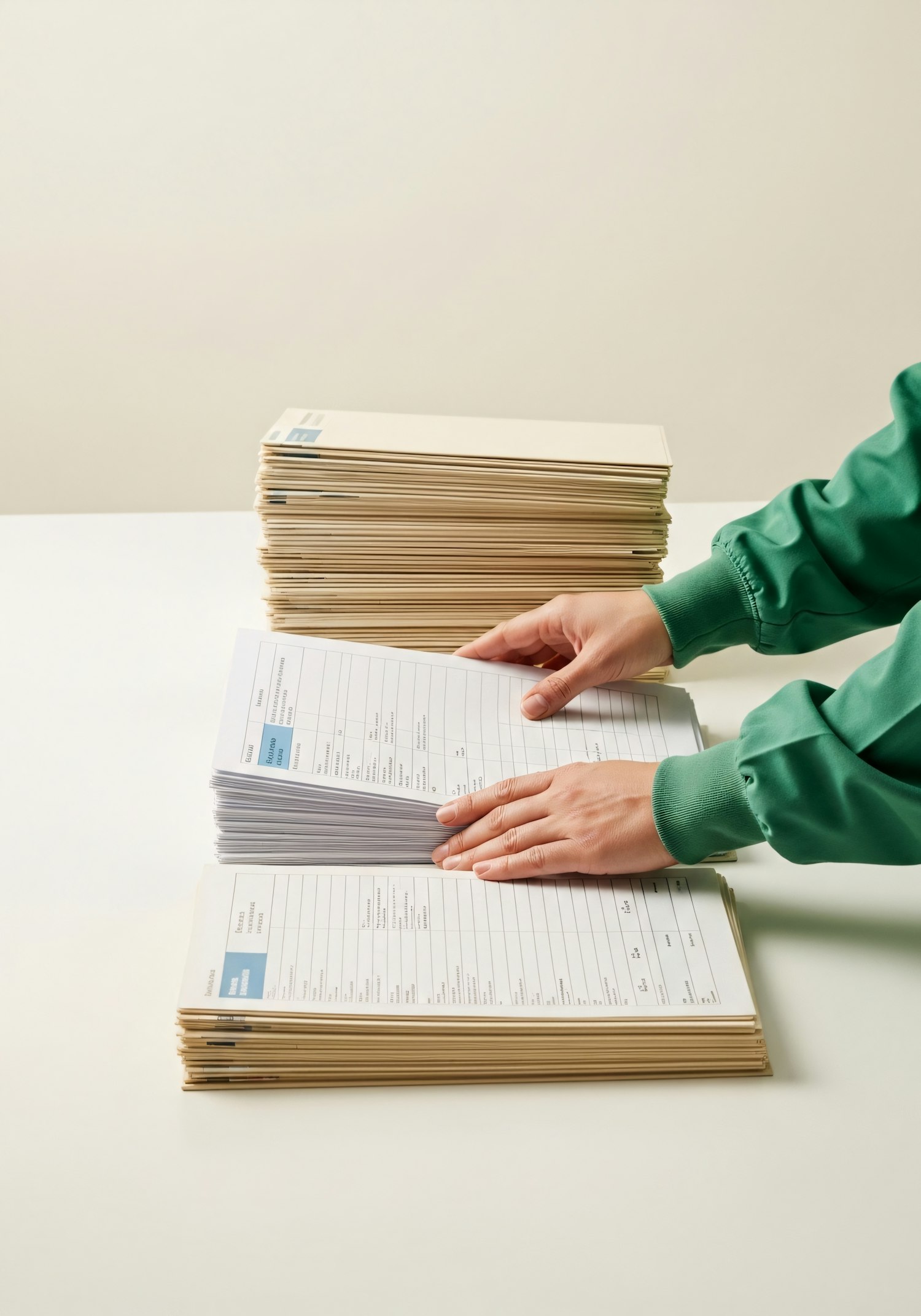Hands organizing documents in beige folders on a white table, showcasing a clean and professional workspace.