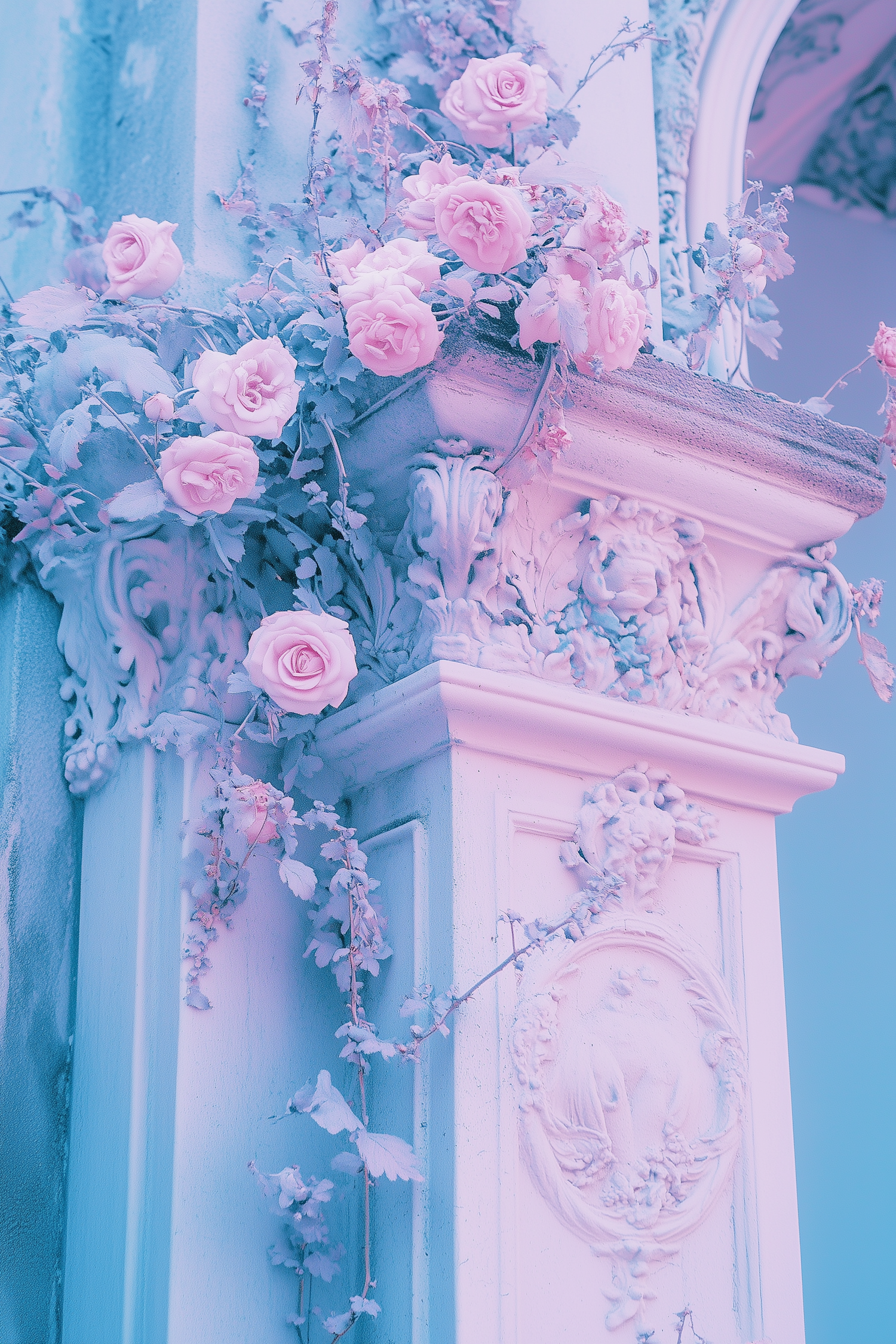 Ethereal pastel column with pink roses and ornate carvings, blending classical architecture with dreamy floral elegance.