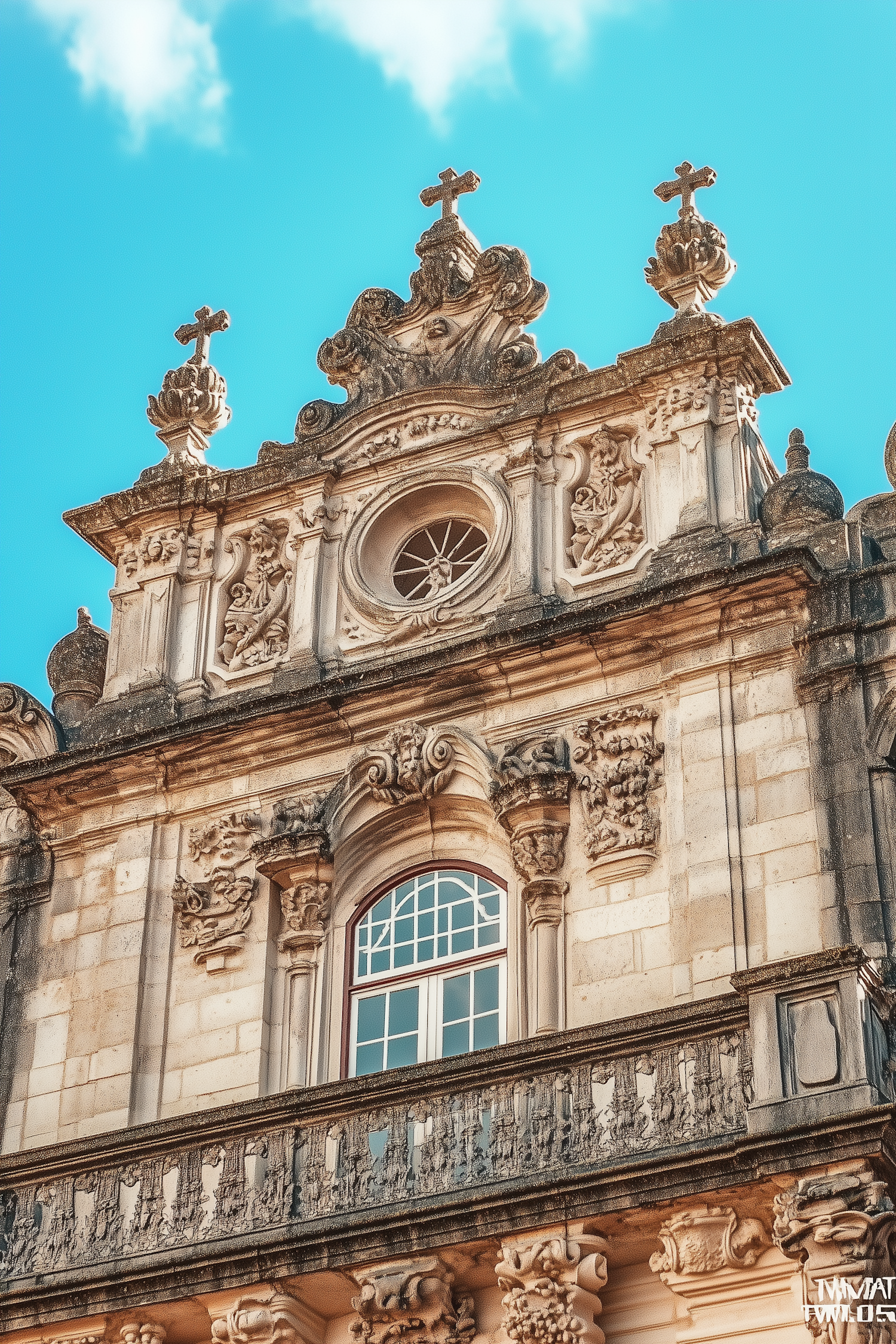 Ornate architectural facade with intricate carvings, circular window, and stone crosses against a bright blue sky.