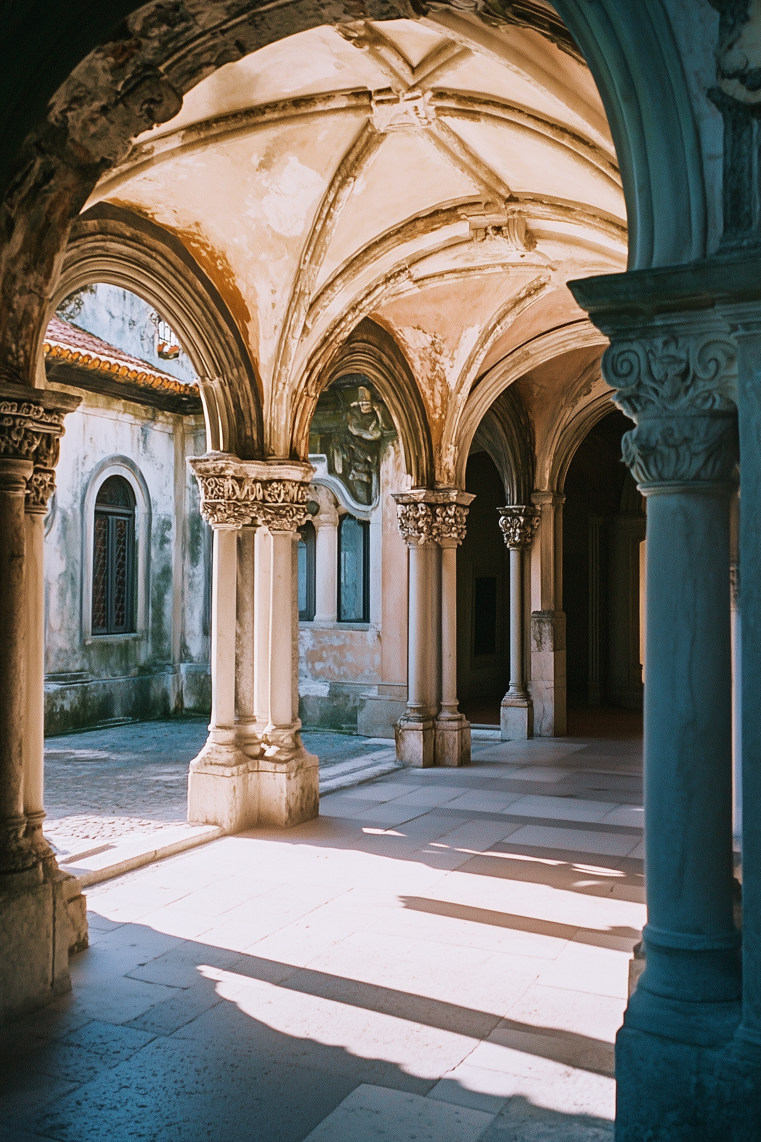 Ornate stone arches and columns bathed in sunlight, casting intricate shadows on a historic courtyard floor.