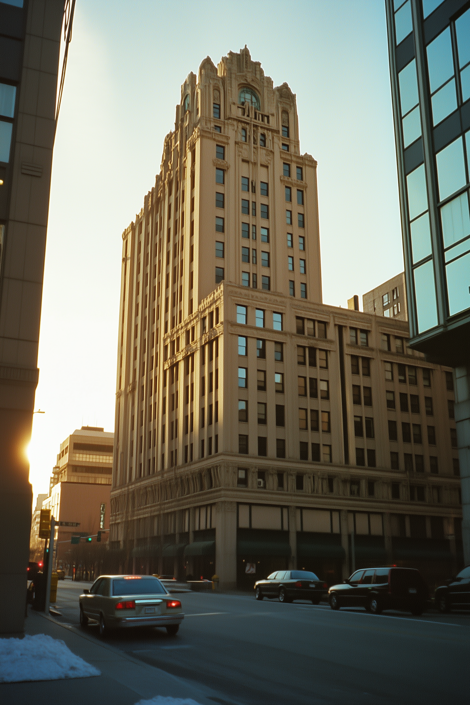 Ornate tall building in cityscape at sunset, with cars on the street and modern structures around.