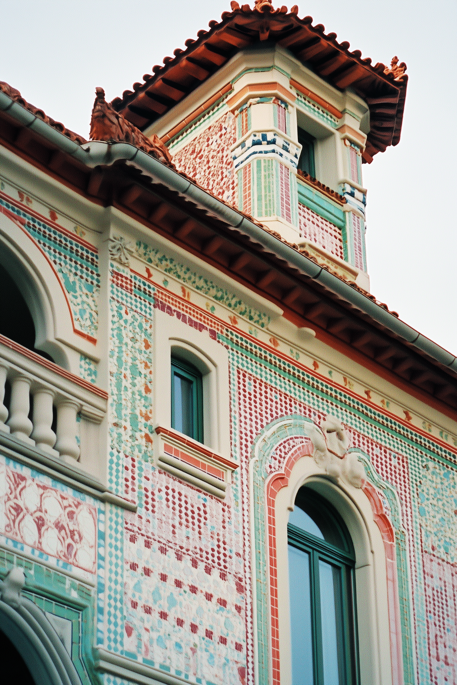 Ornate building facade with colorful tile work, terracotta roof, and decorative arches, showcasing Mediterranean architectural style.