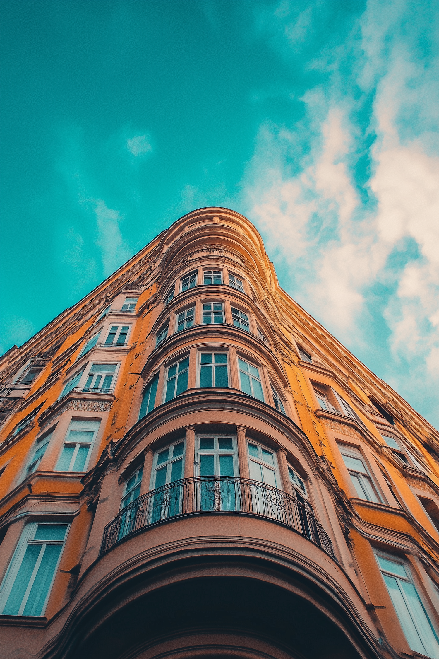 Elegant orange building with curved architecture against a vibrant turquoise sky, featuring ornate balconies and large windows.