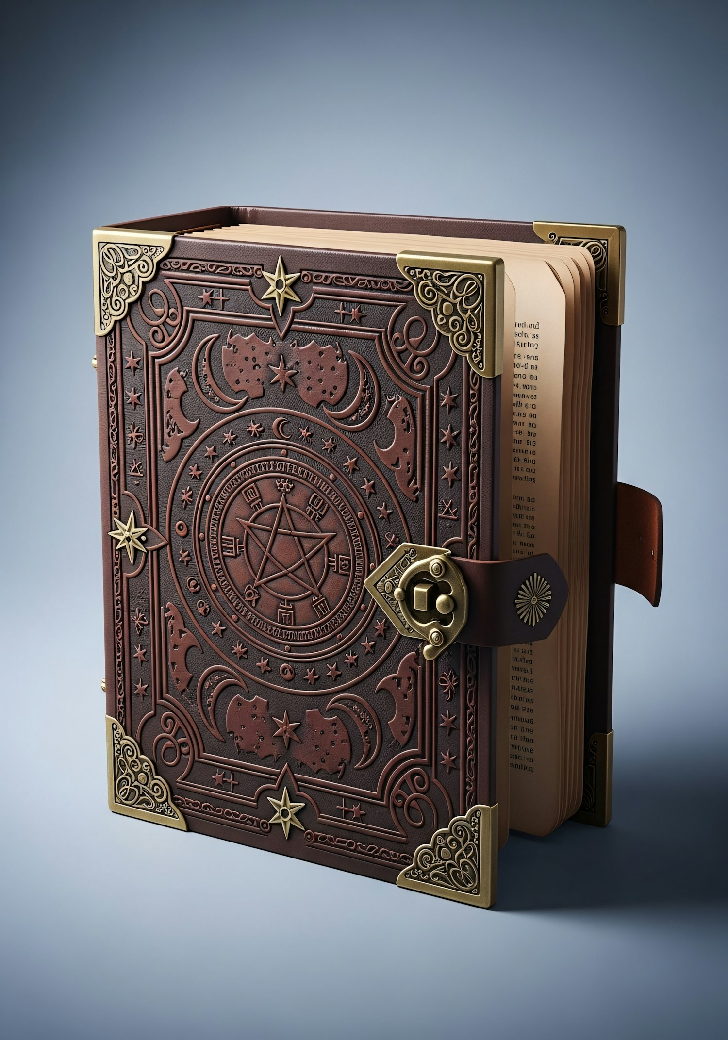 An ornate leather-bound book with celestial designs and golden accents, secured with a clasp, set against a soft blue background.