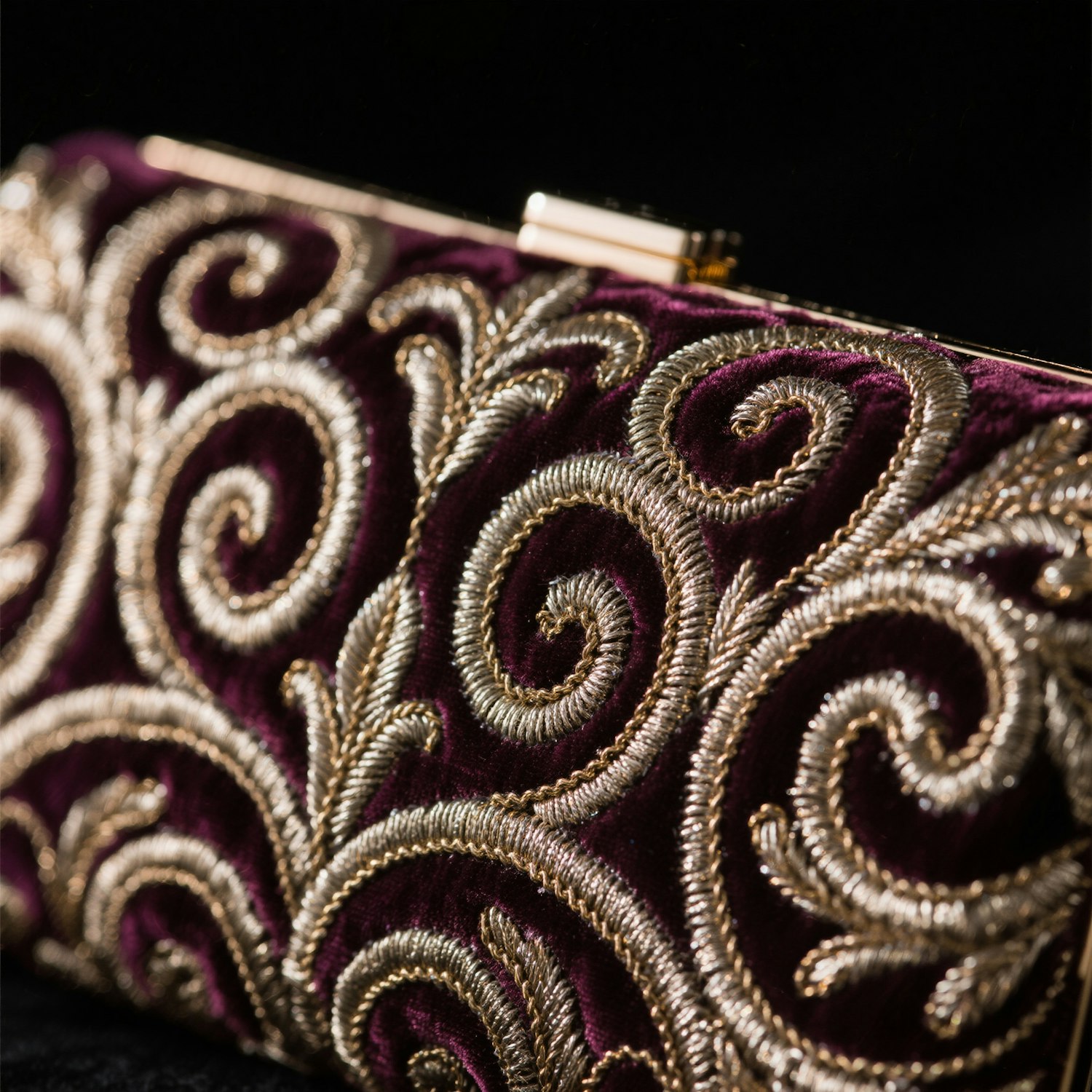 Macro capture of metallic thread embroidery on a velvet evening clutch, spotlighting artisanal detail.