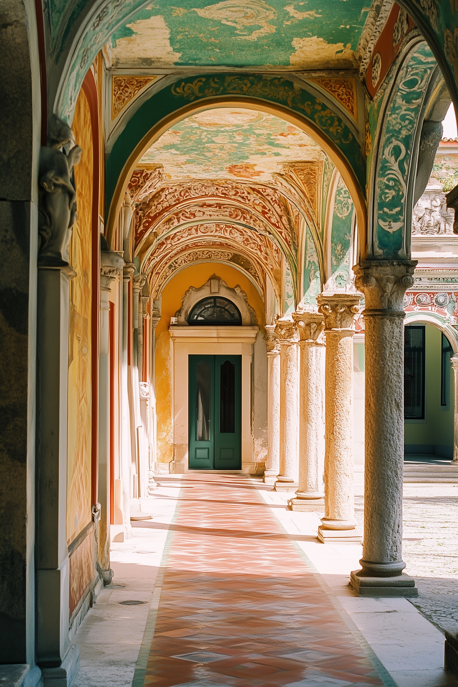 Ornate corridor with colorful frescoes, arches, and a green door. Sunlit terracotta tiles create a warm, inviting atmosphere.