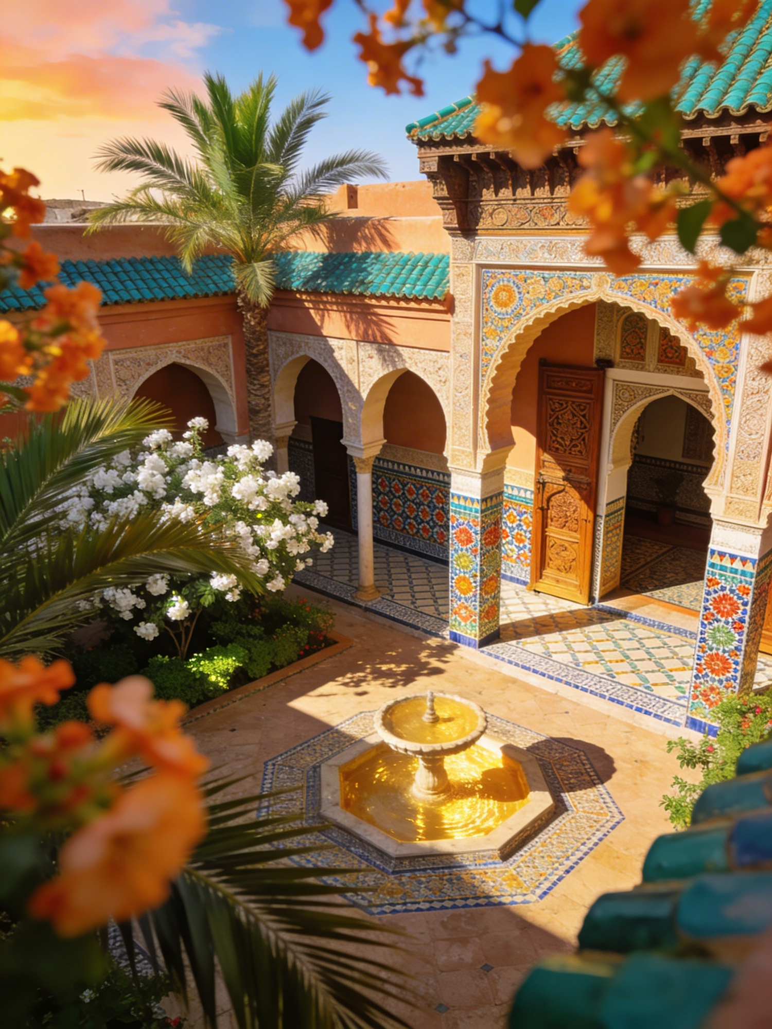 Ultra-realistic high-resolution travel photograph from a slightly elevated perspective, capturing an elegant Moroccan riad courtyard with orange blossoms and palm leaves in the foreground, ornate arches, colorful mosaic zellige tiles, and a central fountain reflecting warm sunset light. Golden-hour sunlight creates crisp highlights and realistic shadows across carved wooden doors, patterned tiles, and lush greenery. The foreground is framed by softly out-of-focus citrus blossoms and palm fronds, leading the eye toward the richly decorated courtyard on the right. In the distance, the open sky glows beneath warm peach and soft blue tones. The overall palette is warm and vibrant, with terracotta clay, turquoise tiles, palm green, blossom white, and golden sunlight. Ultra-detailed, photorealistic, sharp textures, realistic atmospheric depth, natural color grading, editorial travel photography, shot on a full-frame camera, magazine-quality realism, no painting, no illustration, no CGI. Extremely realistic travel photography, crisp fine detail, realistic shadows, true-to-life color, sharp architectural textures, natural optical depth, high-resolution full-frame camera image.