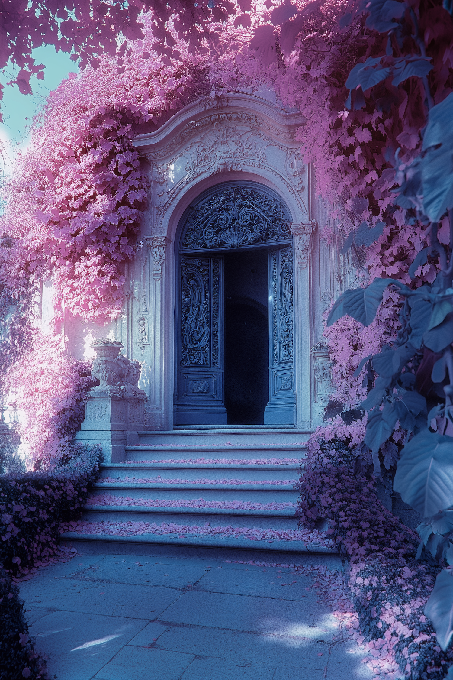 Ornate doorway surrounded by vibrant pink foliage, creating a whimsical, fairytale-like atmosphere with intricate carvings and lush plants.