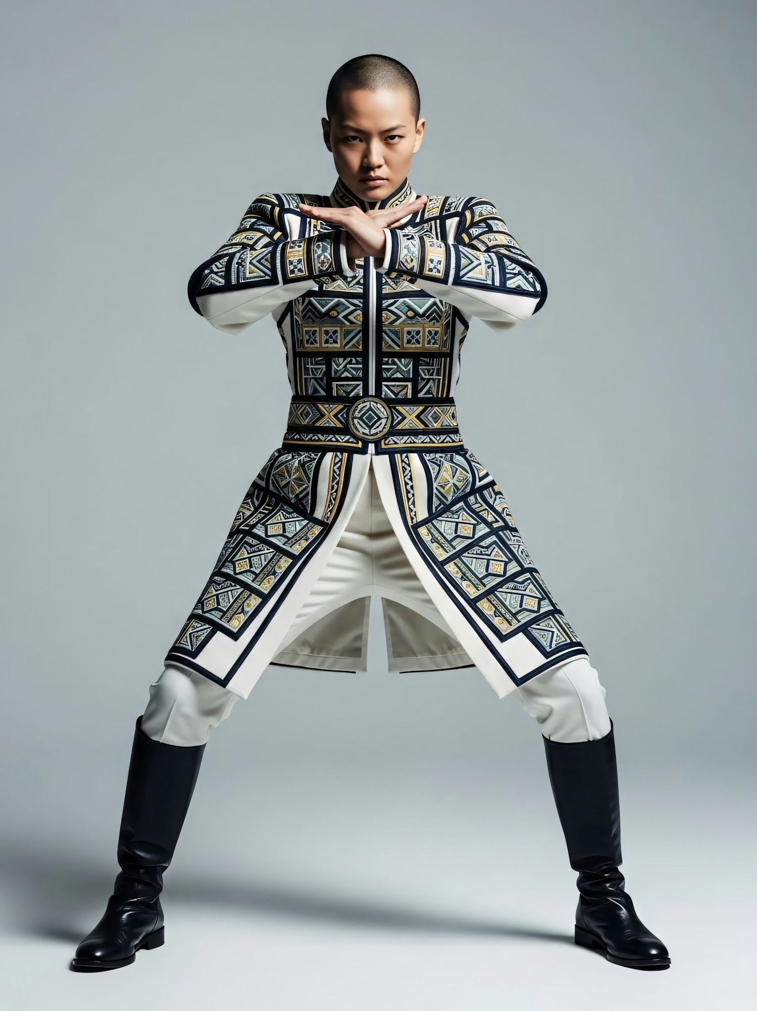 A person in a detailed, patterned outfit strikes a confident pose, showcasing intricate design and bold style against a neutral background.