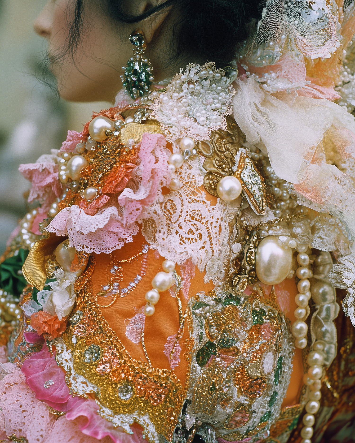 Close-up of an ornate costume with pearls, lace, and sequins in vibrant colors, showcasing intricate craftsmanship and opulence.