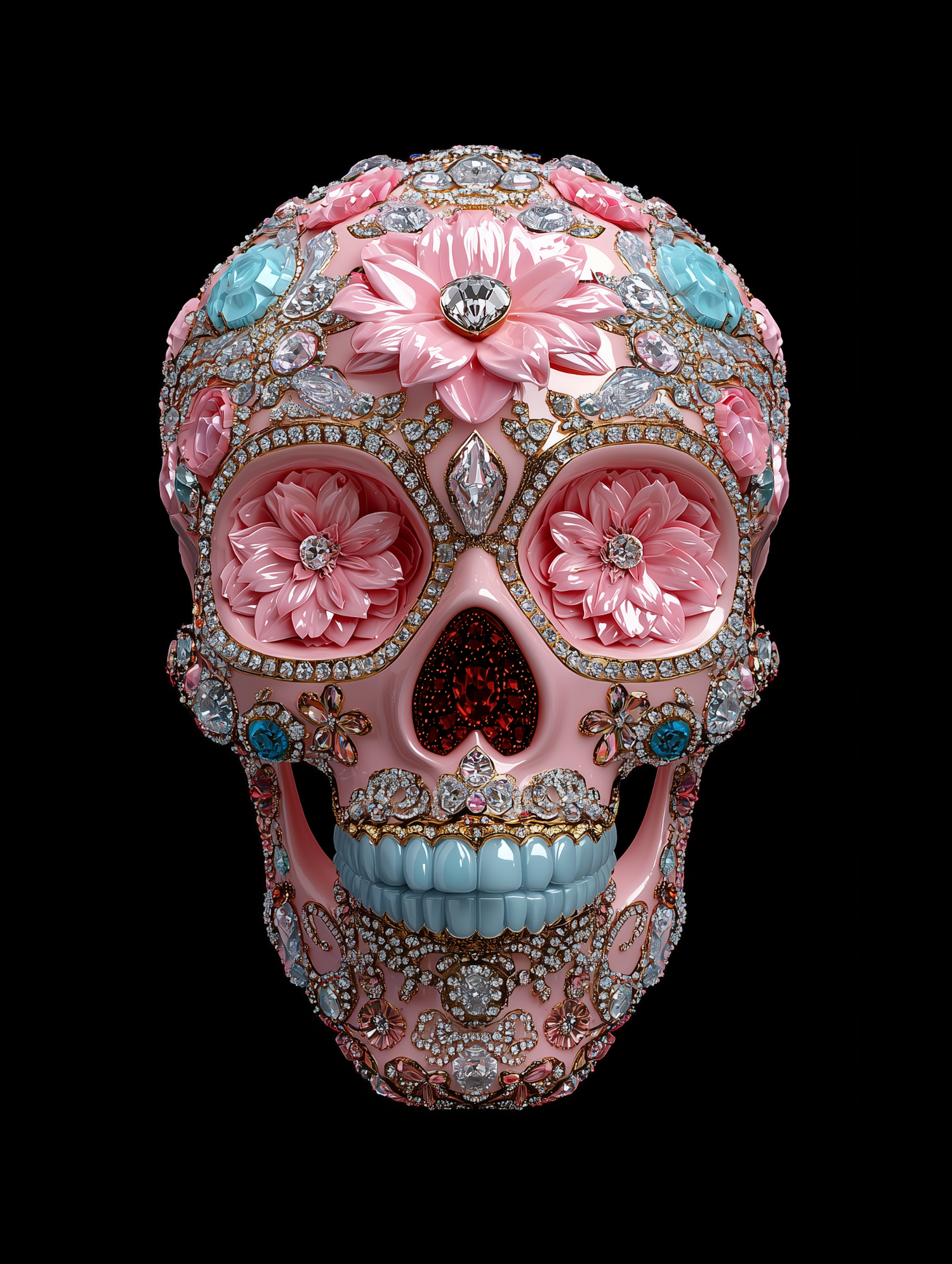 Ornate skull adorned with pink flowers and gemstones, featuring intricate designs and vibrant colors against a black background.