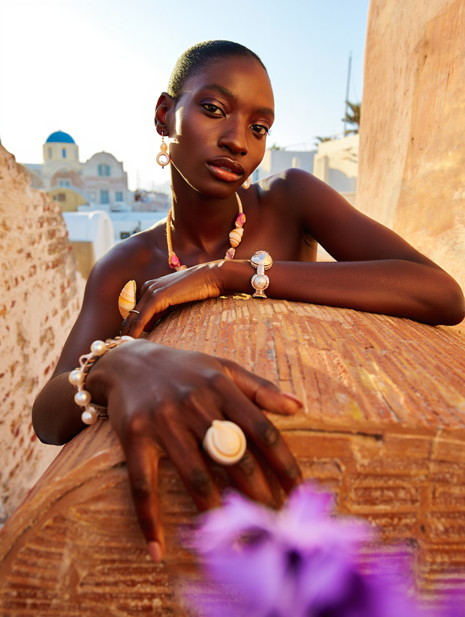 A stylish individual poses outdoors in natural light, wearing detailed jewelry and exuding elegance among Mediterranean scenery.