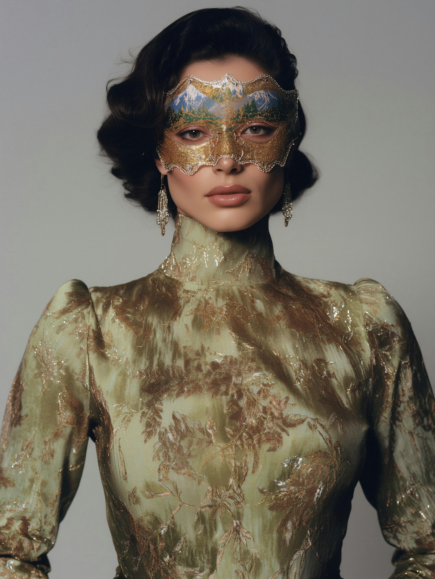 A person in a luxurious green and gold floral dress, wearing an ornate mask with scenic details, and styled hair with elegant earrings.