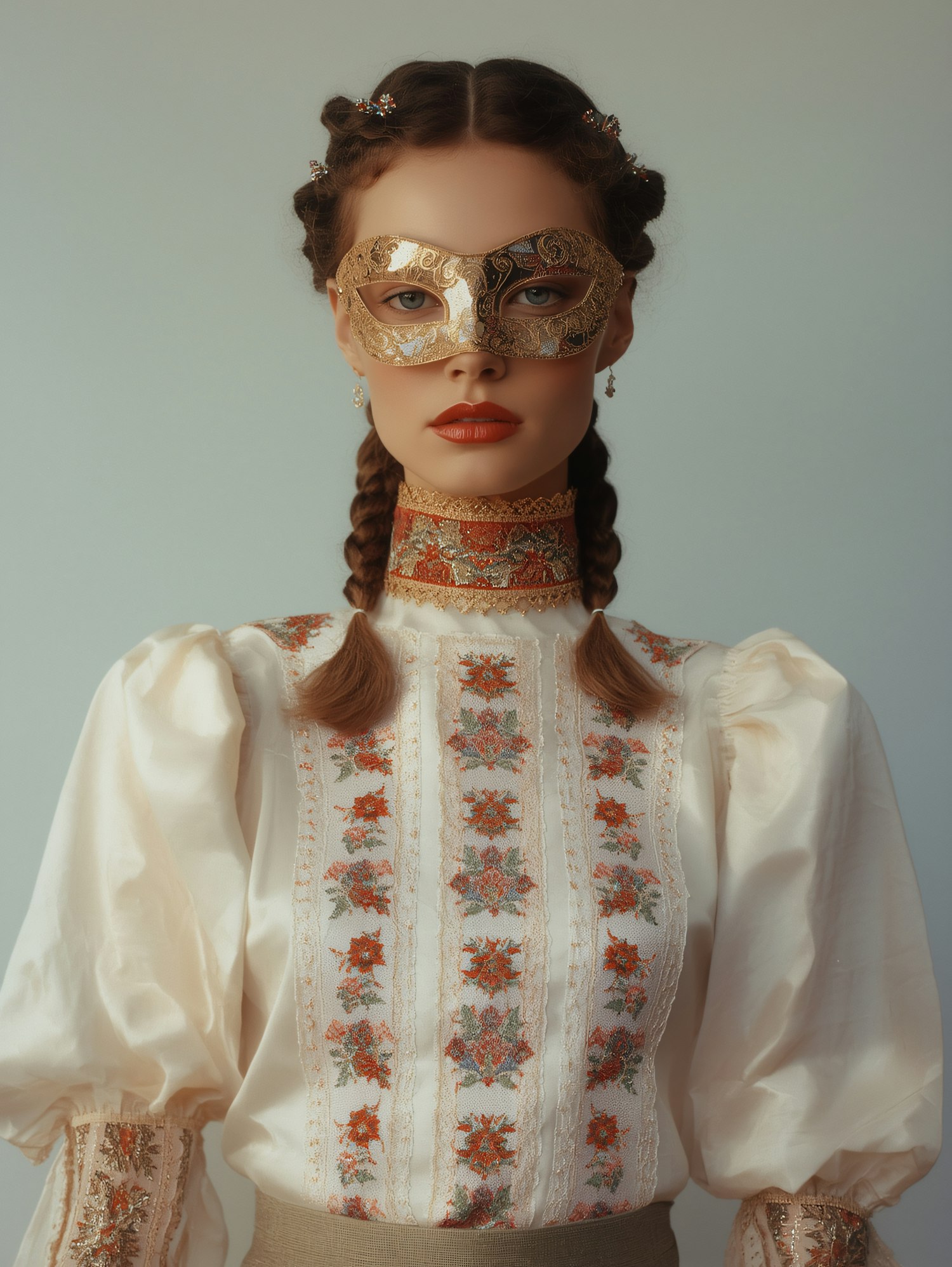 A woman in a traditional embroidered blouse and golden mask, showcasing intricate details and a poised expression against a neutral background.