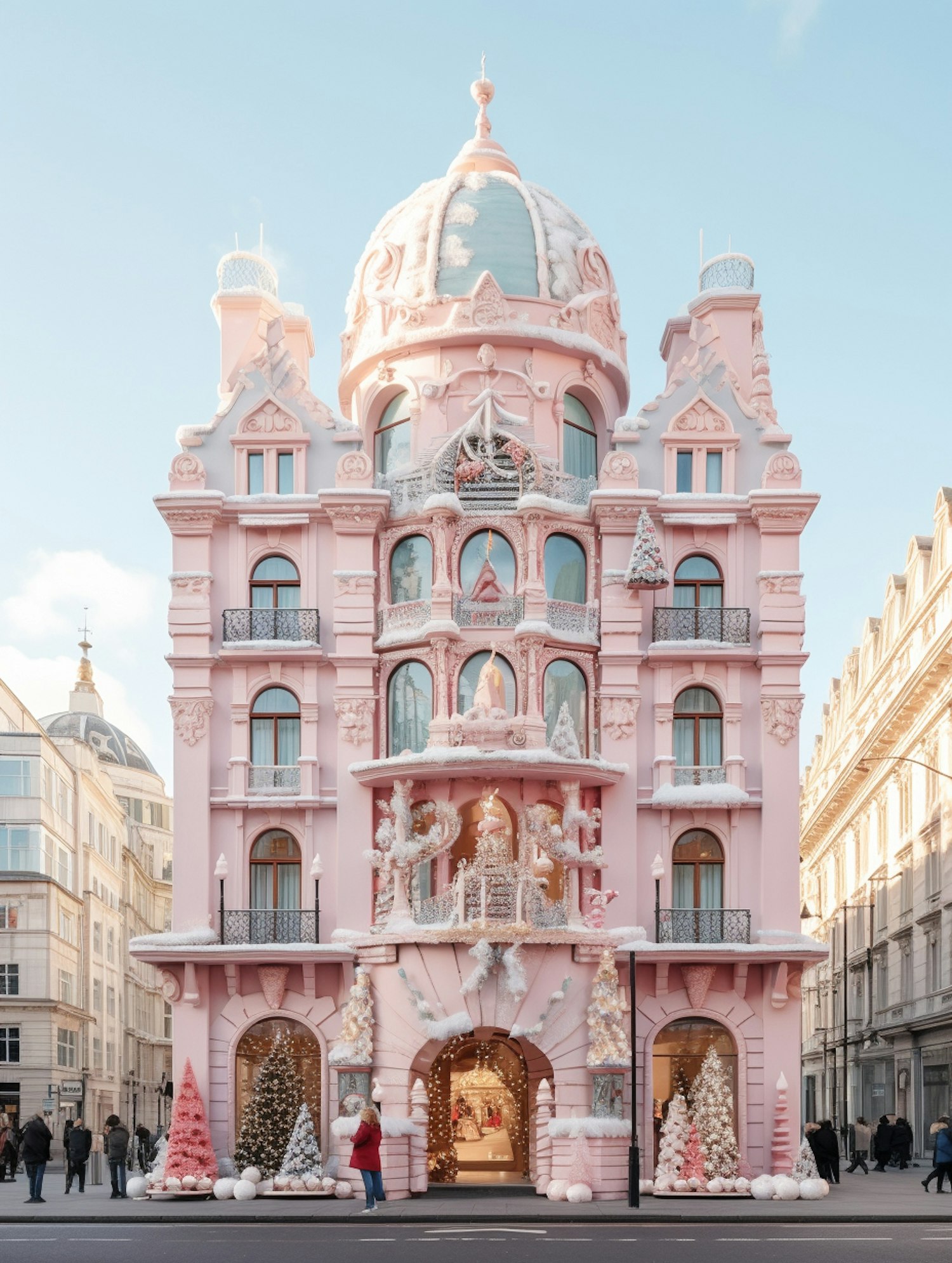 Ornate pink building with festive decorations and snow-like accents, featuring a central dome and Christmas trees in the windows.