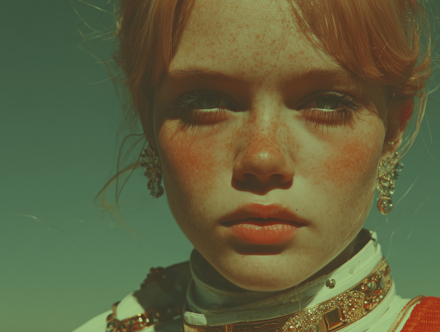 Close-up portrait of a freckled individual with ornate jewelry and warm lighting, set against a greenish-blue background.