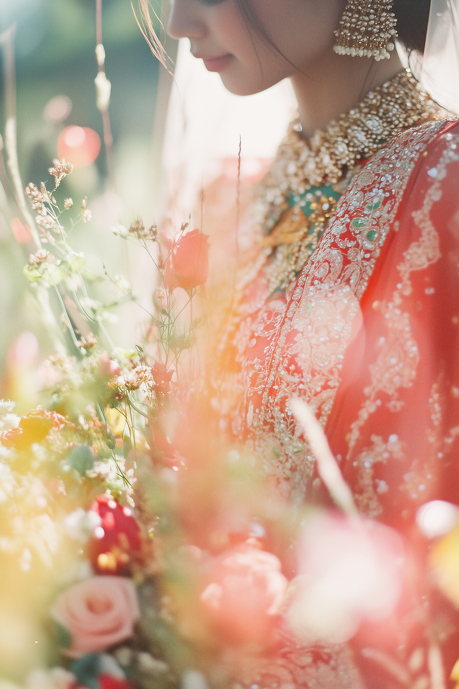 Elegant woman in traditional attire surrounded by soft-focus flowers, wearing ornate jewelry in a dreamy, romantic setting.