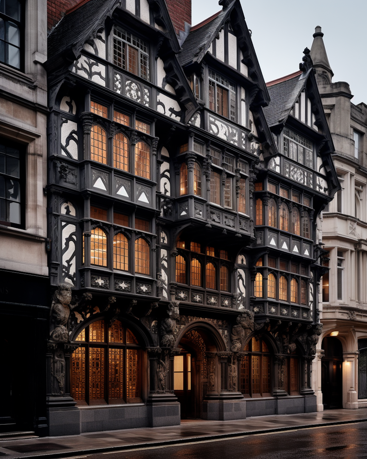 Tudor-style building with intricate timber framing and glowing windows on a city street, creating a warm, historical ambiance.