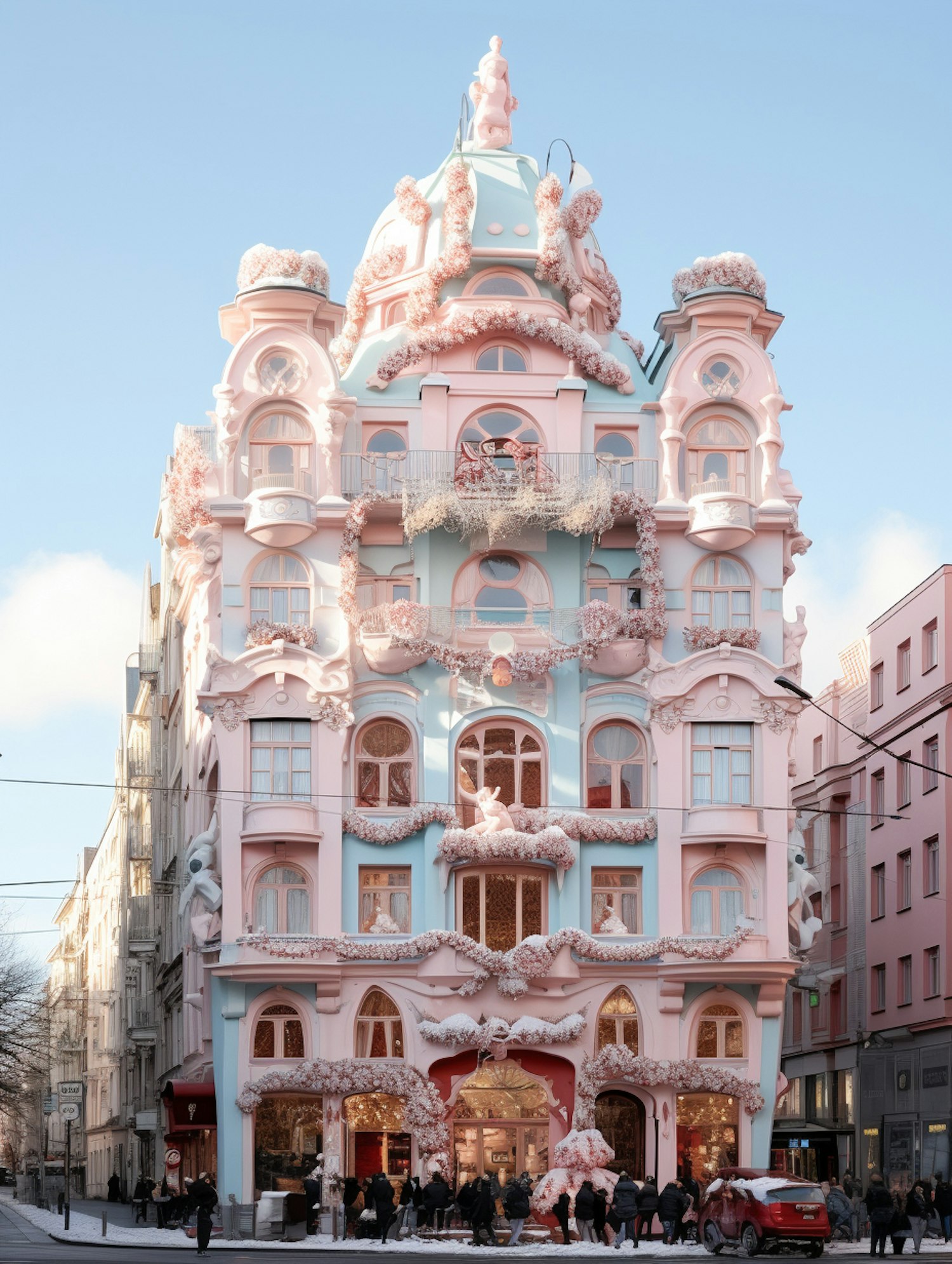 Whimsical pastel building with ornate decorations and floral motifs, attracting visitors on a bustling city street.