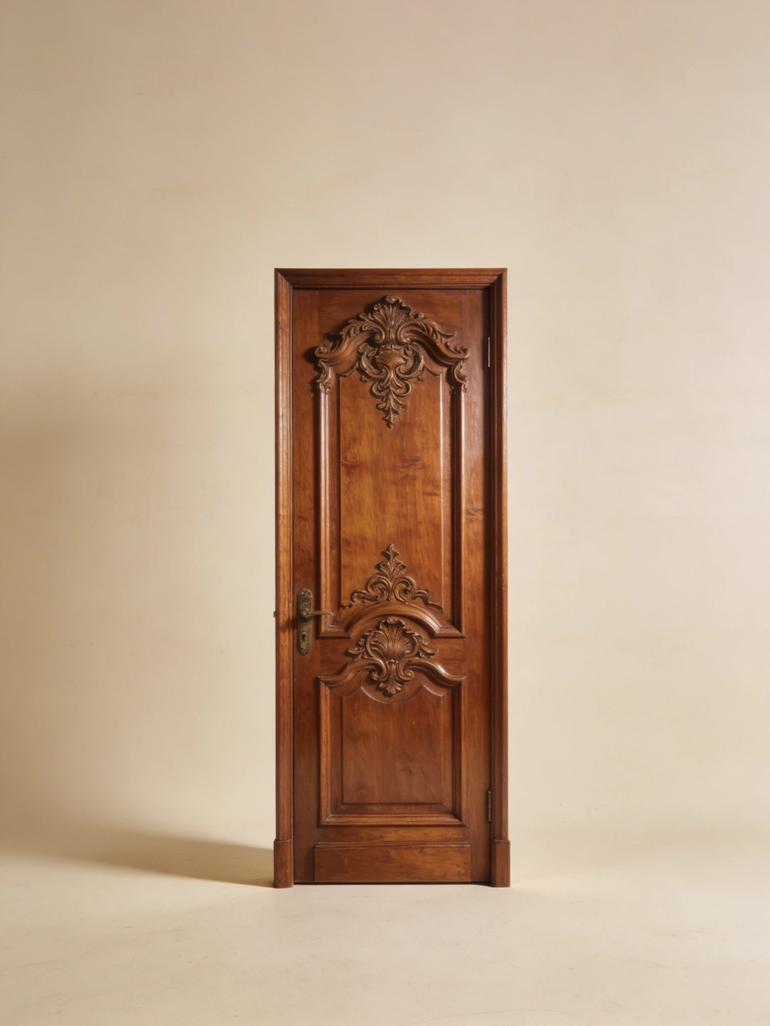 A beautifully carved wooden door with ornate details and a polished finish, set against a plain beige wall.