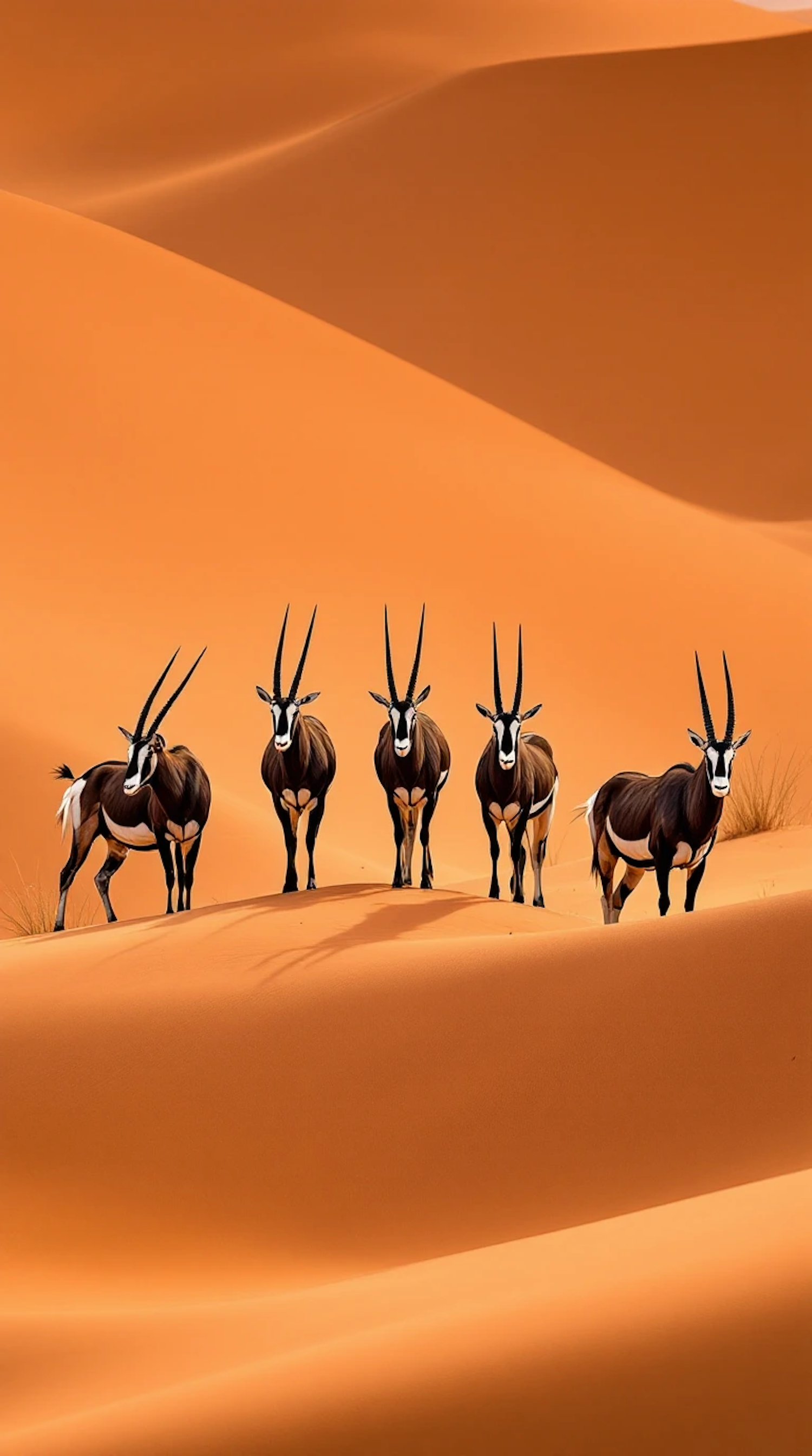 Five oryx stand on golden sand dunes, their striking horns and markings contrasting against the vast desert landscape.