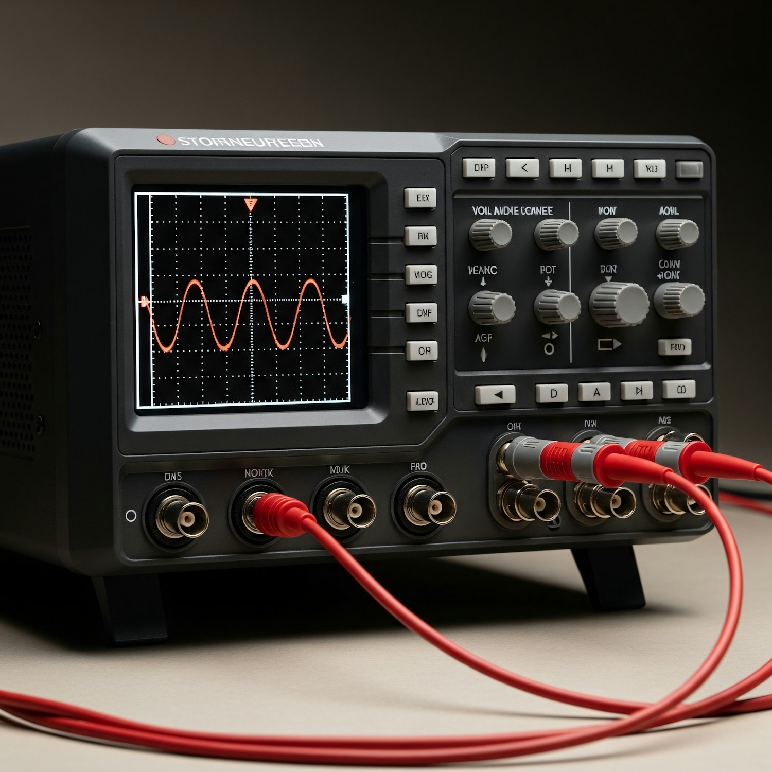 A modern oscilloscope displaying a sine wave, with red cables connected to its input ports, perfect for electronics enthusiasts.