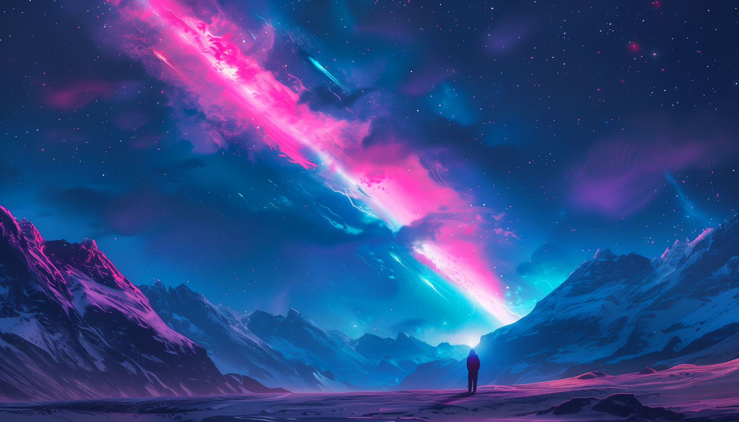 A lone figure stands under a vibrant aurora in a snowy mountain landscape, creating a surreal and magical atmosphere.