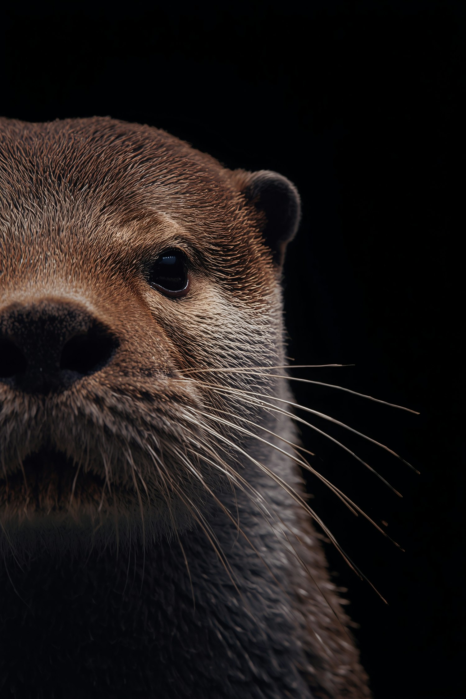 Close-up of an otter's face with detailed fur and whiskers, set against a dark background, showcasing its expressive eyes and natural beauty.