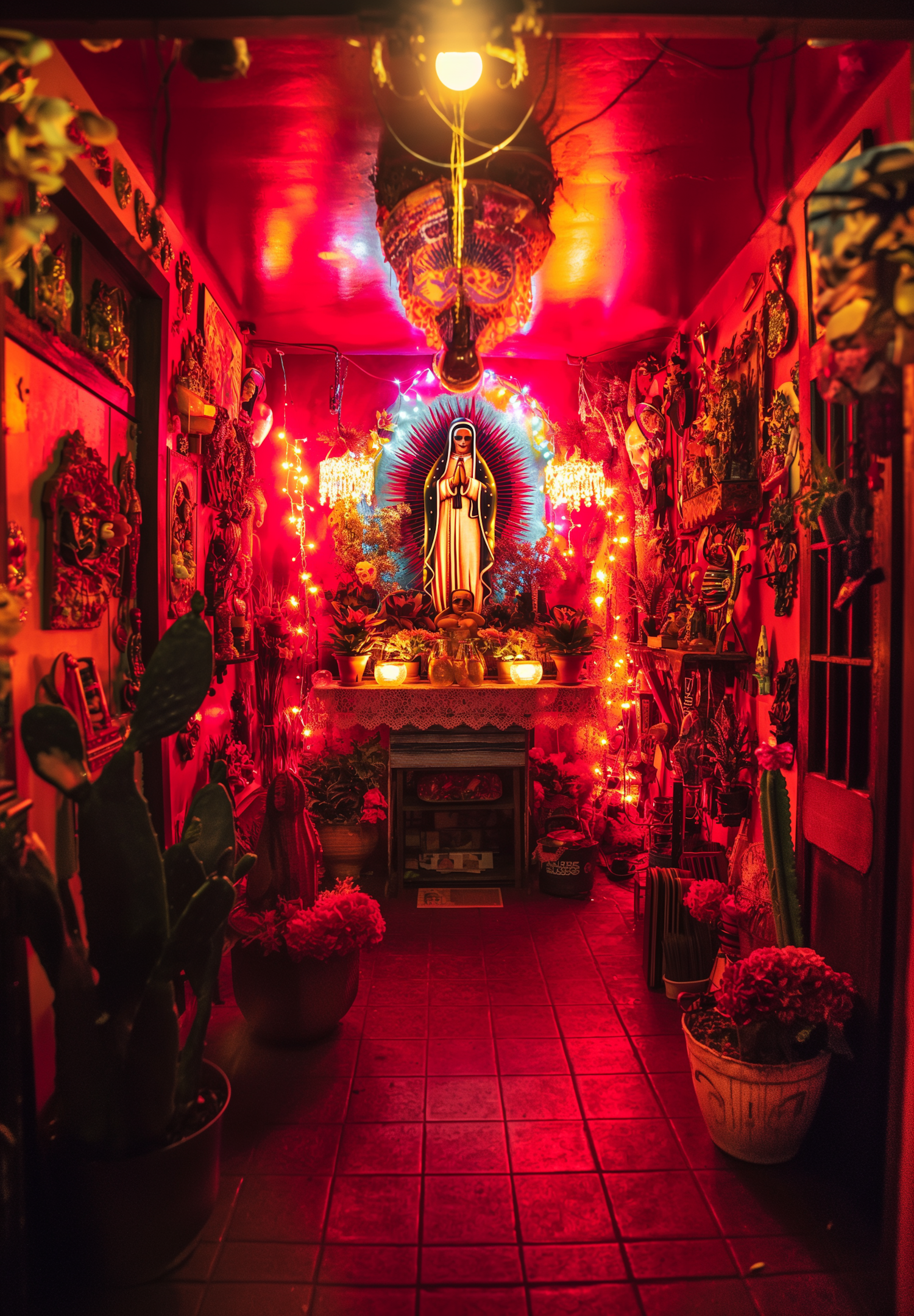 A vibrant altar with a Virgin Mary statue, surrounded by colorful lights and decorations, creates a warm, spiritual ambiance.