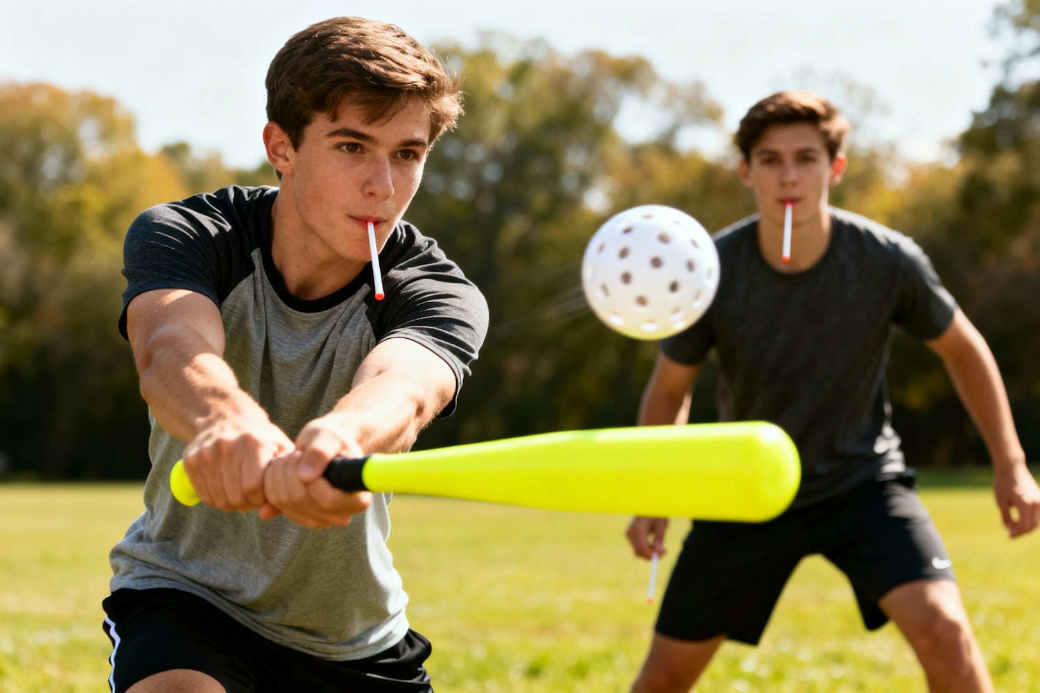 An ultra-realistic photo of two young men playing wiffle ball. The man in the foreground holds a bright yellow bat mid-swing as a perforated white plastic ball approaches him. and is sucking on a lollipop inside the mouth on both. Only the stick is visible with a normal shaft size. fun, playful imagery here when we get product shots. PLAYFUL energy here.